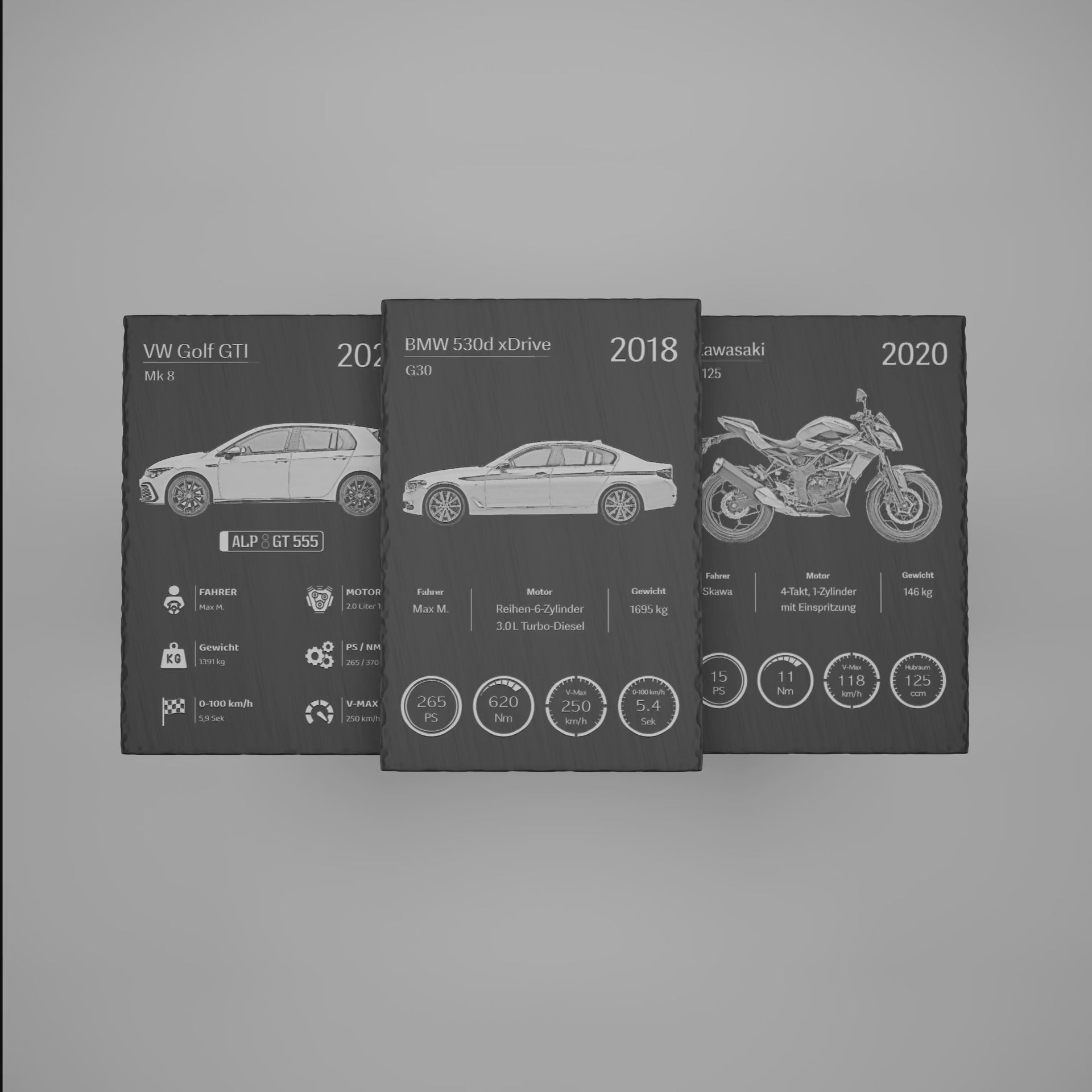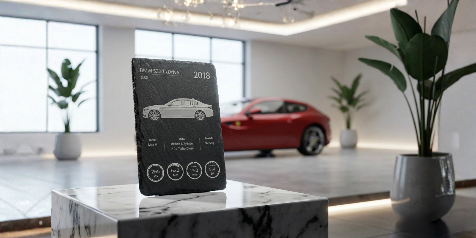 in kunstvolle Gravuren auf Naturstein. Jedes Stück erzählt die Geschichte seines Fahrzeugs und seines Besitzers.